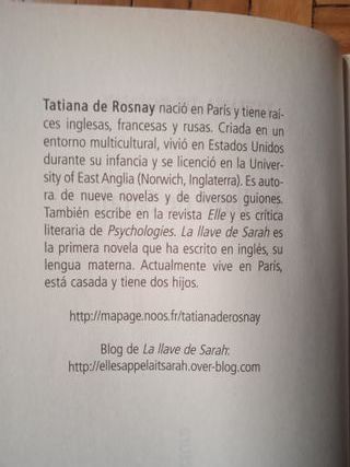 'La llave de Sarah'. Tatiana de Rosnay (Punto de lectura, Madrid, 2008). Título original: 'Elle sappelait Sarah ́' (2007). Traducción: Jose Miguel Pallarés ́. 398 páginas. Tapa blanda. Blanco y negro. DL: B-38.334-2008. ISBN: 978-84-663-2155-6. En París, 2002, Julia Jarmond prepara un reportaje sobre el aniversario de una redada nazi en 1942 y la historia particular de una niña judía llamada Sarah. Esta historia impactará en la vida personal de Julia. Lea la primera página y, si le gusta... Más novelas sobre el nazismo en mi perfil. Más música, cine y literatura en mi perfil.