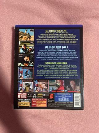 Edición especial limitada y numerada de la saga Las Colinas Tienen Ojos en Blu-ray. - Incluye 3 películas originales. - Contiene Las Colinas Tienen Ojos 1 y 2, Experimento Mind Ripper y Las Colinas Tienen Ojos 3. - Incluye 8 postales.
