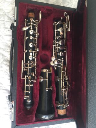 Oboe Buffet Crampon modelo 4051 en perfecto estado y listo para tocar. - Sistema conservatorio semi-automático. - Llave Fa de segunda y Sib grave. - Cuerpos de madera de granadilla. - Llaves con baño de plata. - Instalada argolla para atril de marcha en segundo cuerpo para mejor visibilidad de la partitura (posibilidad de atril en la campana, como es habitual). - Reciente ajuste, limpieza, aceitado, instalación anilla atril y enzapatillado + espigas. - Ideal para estudios de conservatorio y tocar en exterior (atril de marcha con mejor visbilidad que el estándar). - Incluye estuche original Buffet.