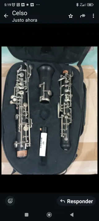 Instrumento de viento madera, tipo oboe. Se encuentra en su estuche. - Cuerpo de madera oscura. - Llaves metálicas plateadas.
