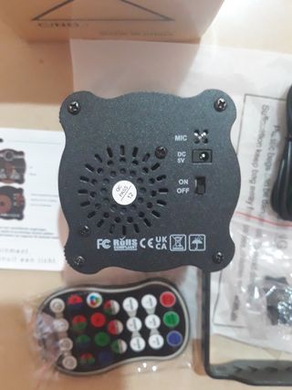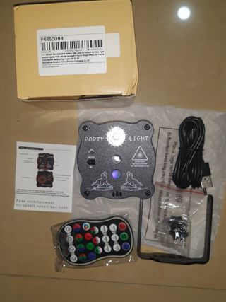 Láser RGB disco DJ, versión completa con batería incorporada de hasta 4 horas de funcionamiento. 60 patrones de diseño. Modo con micrófono / modo automático / modo estroboscópico. Enfriamiento activo del láser con ventilador incorporado. Incluye soporte, control remoto, manual e cable USB 5V.