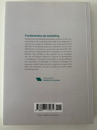 Libro académico de la asignatura de Fundamentos de marketing. Universidad de Alicante. Está como nuevo tan solo tiene las dos primeras páginas subrayadas pero lo demás está intacto