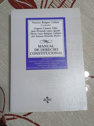Editorial Tecnos, dos volúmenes, Constitución y fuentes del derecho, derecho constitucional europeo, Tribunal Constitucional, Estado Autonómico, Derechos y libertades fundamentales, deberes constitucionales y principios rectores, instituciones y órganos constitucionales.