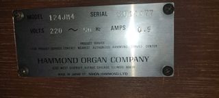 Magnifico órgano Hammond en excelentes condiciones. - Modelo 124JM4. - Número de serie 8044477. - 220 voltios, 50 Hz, 0.5 amperios. - Fabricado en Japón por Nihon Hammond, Ltd. - Incluye la banqueta.