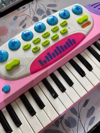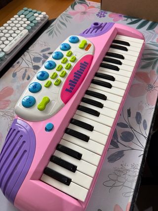 Organo musical de juguete en color rosa y morado, con teclas blancas y negras. - Diseño colorido y divertido. - Altavoz integrado en el lateral. - Botones de control en la parte superior.