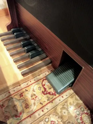 Órgano electrónico Bontempi KP748.93 con dos teclados y controles. - Teclado superior e inferior. - Panel de control con botones y deslizadores. - Pedalera completa. - Acabado en madera oscura. - Funciona perfectamente. - Se incluye banqueta regulable. - No envío. Sólo recogida.