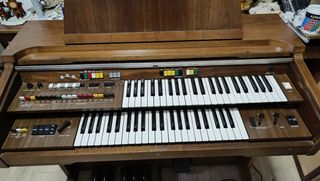 Órgano electrónico de estilo vintage, con un diseño clásico en madera. Marca Welson. - Dos teclados. - Panel de control con botones de colores y deslizadores. - Pedales inferiores. - Compartimento para partituras.