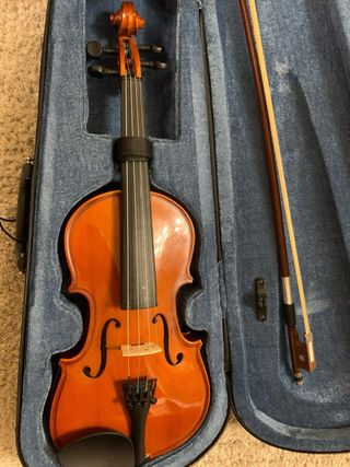 Violín de tamaño 1/4, ideal para principiantes de uso escolar. Incluye funda, arco y resina, poco uso, nada de sus componentes esta roto. - Tamaño: 47 cm. - Incluye funda. - Incluye arco. - Incluye resina ya desmenuzada para reponer.