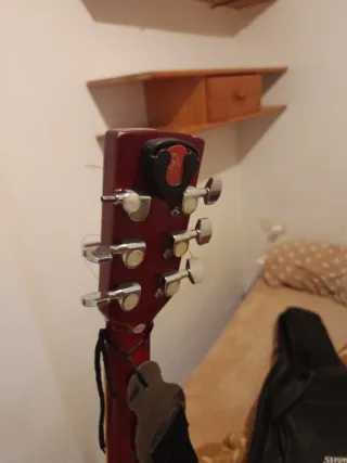 Guitarra acústica con un acabado degradado de rojo a negro. - Cuerpo de madera. - Diapasón con trastes. - Cuerdas metálicas.