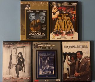 Lote de 5 películas originales en DVD de la icónica actriz Sofia Loren: - El puente de Casandra - La caída del Imperio Romano - Ayer, hoy y mañana - Dos mujeres - Una jornada particular