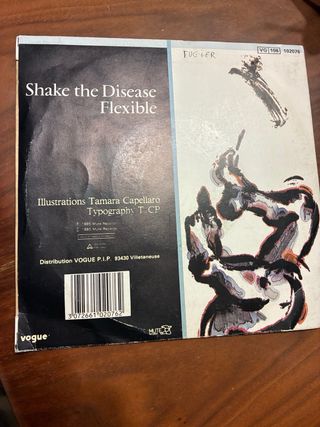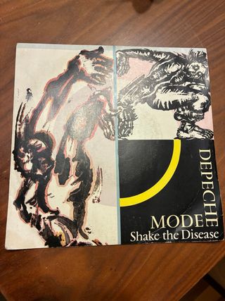 Single de vinilo del grupo Depeche Mode. - Título: Shake the Disease. - Diseño artístico dividido en dos partes. - Incluye el nombre del grupo y el título de la canción en la parte inferior derecha.