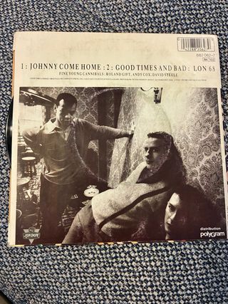 Single de vinilo del grupo Fine Young Cannibals. - Título: Johnny Come Home. - Diseño gráfico abstracto y colorido.