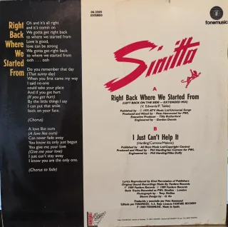 Maxi Single de vinilo de Sinitta. - Título: Right Back Where We Started From - Mix: Left Back On The Side Mix - Año: 1989