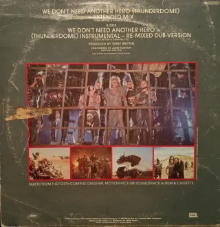 Vinilo de Tina Turner con la canción We Don't Need Another Hero (Thunderdome). - Tema: We Don't Need Another Hero (Thunderdome) - Extended Mix. - Incluye Mad Max: Más allá de la Cúpula del Trueno Soundtrack.