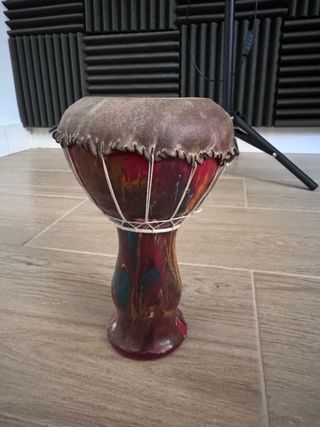 Tambor Darbuka de estilo artesanal, con un diseño único y llamativo. - Cuerpo con acabado multicolor pintado a mano. - Parche de cuero natural. - Cuerdas de sujeción de color blanco.