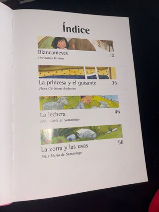 Libro infantil para niñas de 4-5 años! tiene 4 cuento: blancanieves, la princesa y el guisante, la lechera y la zorra y las uvas! Todo esta claramente con su titulo y cada pagina contiene imagenes relacionadas con el cuento