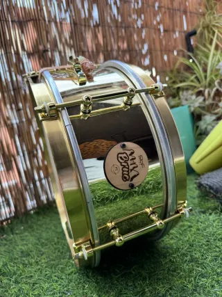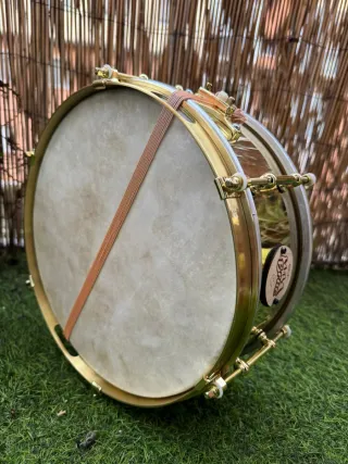 Tambor de latón edición "Bruc" - Cuerpo principal de latón pulido. - Aros y herrajes acabados en color oro. - Parche con logo circular de madera. - Parches del tambor de piel de cabra - Bordon de seda