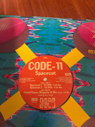 Vinilo de Code 11 con el tema Spacecut. Edición 1995 El vinilo esta como nuevo - Género: Dance & Electro. - Sello: United Ravers Records. - Referencia: UR 001.