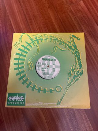 Vinilo de Rubicon Massacre Ltd. con un diseño llamativo. - Portada con ilustración en tonos verdes y amarillos. - Sello Overdose Production en la parte inferior izquierda. El vinilo suena perfectamente pero presenta alguna ligera marca