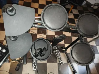 Se vende batería electrónica en buen estado, ideal para practicar o para iniciarse en la música. - Incluye todos los componentes visibles en la imagen. - Pads de batería y platillos. - Módulo de sonido. - Pedales. - Soporte y cables.