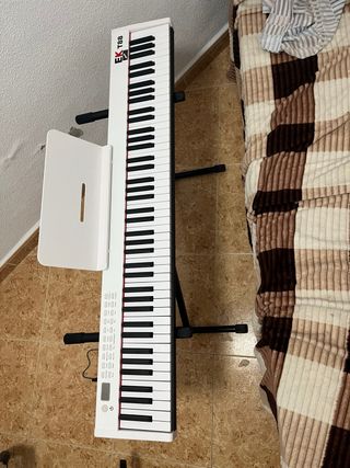 Teclado digital blanco, casi nuevo, usado pocas veces. Ideal para iniciarse en la música. - Color blanco. - Incluye soporte. - Incluye pedal. - Se entrega en Oviedo. Detalles: Con teclas táctiles Con conector para auriculares. Función de grabación y reproducción Con Bluetooth. Contenido: Piano digital x 1 soporte doble en forma de X x 1 funda de piano portátil x 1 pedal de sostenido de metal x 1 adaptador de alimentación. Especificaciones: Piano digital Color: blanco Pantalla de visualización: Teclado de pantalla LCD con 88 teclas semipesadas Polifonía (máx.): 64 tono/ritmo