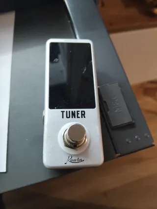 Pedal afinador de la marca Rowin. Compacto y fácil de usar. - Botón de activación. - Diseño en color blanco.