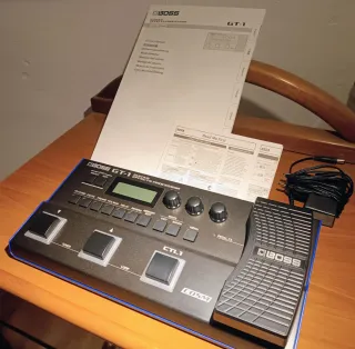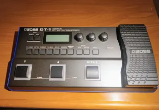 Pedalera multiefectos Boss GT-1 para guitarra eléctrica. - Procesador de efectos. - Pantalla LCD. - Controles giratorios. - Pedal de expresión. - Botones CTL1, Tuner y Loop. No tiene prácticamente uso y la entrego tal y como la compré: en su caja, con manual de instrucciones, adaptador de corriente y regalo un cable Jack.