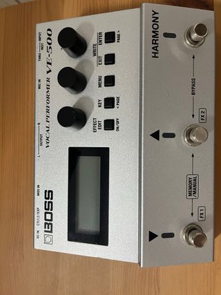Processador de veu Boss VE-500, tant per a directe com per a gravació en estudi. El pedal està en molt bon estat, hi ha alguna rascadeta, ha sortit de casa 2/3 cops i funciona perfectament. Característiques destacades: • Harmonies i correcció de to: Genera harmonies vocals automàtiques seguint la teva guitarra o via MIDI. • Efectes: Reverb, Delay, Modulació, Distorsió, Vocoder i més. • Looper integrat: Ideal per a solistes o experimentació creativa. • Connexions: Entrada XLR amb alimentació Phantom, entrada de guitarra (Thru), MIDI i USB. Inclou: Font d'alimentació original.