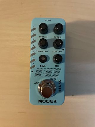 Pedal de efectos Mooer E7 Synth. Un pedal versátil para guitarristas y bajistas que buscan sonidos únicos. Nuevo, solo usado en el local para probarlo. - Controles: Attack, Speed, High Cut, Low Cut, Save, Mix. - Alimentación: DC 9V. - Diseño compacto y robusto.