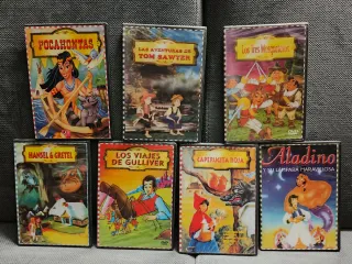 Películas infantiles en formato VHS. Todas son originales. 3€ la unidad. Descuento si te interesa más de una. - Hércules - 101 Dálmatas - 101 Dálmatas (más vivos que nunca) - Stuart Little - El Gato con Botas - Oliver y su Pandilla - FernGully 2 - Pokémon: El reto del Samurai - Pippi Calzaslargas - La Leyenda de Aladino y la Lámpara Maravillosa - Cuento de Navidad - Hansel y Gretel - Evasión en la Granja - Viaje al Mundo en 80 Días - Don Quijote - Manuelita