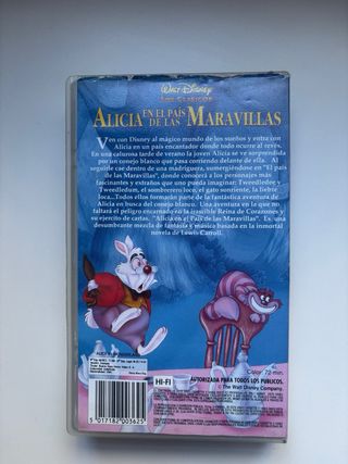 Título: Alicia en el País de las Maravillas Colección: Walt Disney “Los Clásicos” Nº Expediente del Ministerio de Cultura: 17489 Nº Depósito Legal: M-23114-91 Versión: Doblada Distribuidora: Buena Vista Home Video S.A. Nacionalidad: USA Duración: 72 min aproximadamente Formato: HI-FI, VHS Premios destacados: Ninguno Etiqueta: Amarilla original con Mickey Aprendiz de Brujo (Walt Disney Home Video) en color Estado: Usado, pero en buen estado