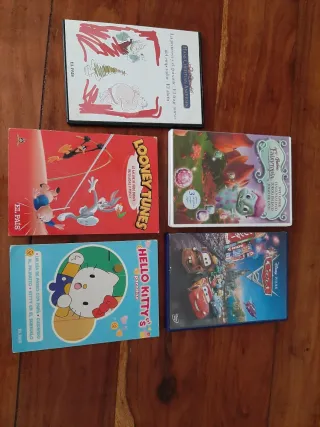 Conjunto de cinco películas infantiles en formato DVD. - La Princesa y el Guisante / El Traje Nuevo del Emperador / El Abeto (Hans Christian Andersen) - Looney Tunes - Barbie Fairytopia - Hello Kitty's Paradise - Cars 2