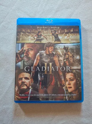 Película Gladiator II en formato Blu-ray. - Incluye Blu-ray + Bonus. - La carátula muestra una cita de Miguel Ángel Romero, Cinemania: Ridley Scott trae de nuevo la gloria al Coliseo, con una secuela soñada. - La condición es Perfecto.