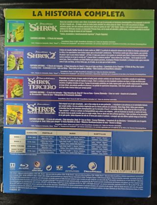 Colección completa de Shrek en formato Blu-ray. - Incluye todas las películas de la saga. - Audio y subtítulos en español.