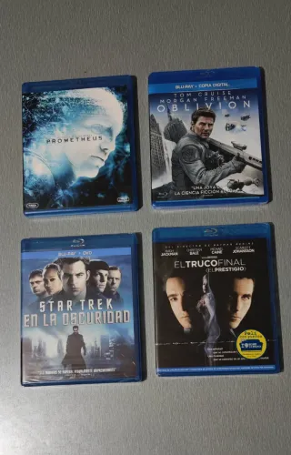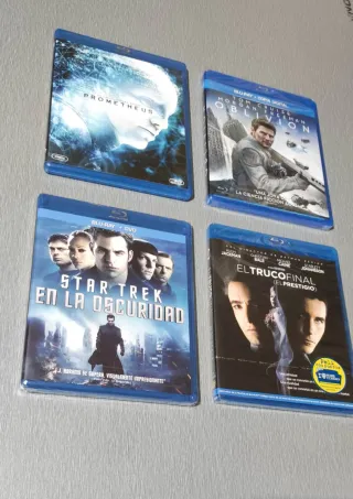 Conjunto de cinco películas en formato Bluray, todas nuevas son abrir con el precinto puesto excepto Prometheus que está abierta pero en estado perfecto. - Prometheus - Oblivion - Star Trek: En la Oscuridad - El Truco Final (El Prestigio) - Batman (Año 1989) Tienen idioma original inglés y español. Colección, pack, oferta, regalo, DVD, ciencia ficción.
