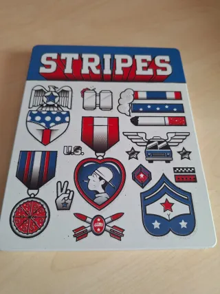 B.REF.0087 Película en formato Blu-ray. - Diseño de la caja metálica con temática Stripes. - Incluye varios diseños de pegatinas o tatuajes temporales. - Diseños con águilas, medallas, cigarrillos, cohetes y más.