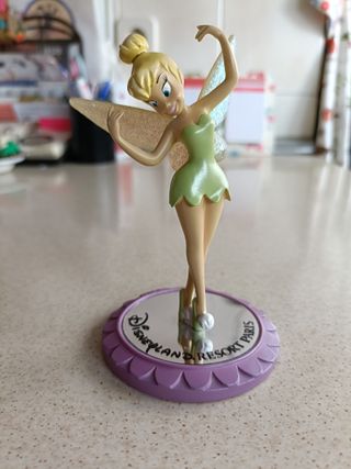 Figura de resina de Campanilla/Tinkerbell, de la película "Peter Pan" (Disney), sobre un espejo redondo con borde morado. Muy rara y difícil de encontrar. Comprada en Disneyland Paris en 2003. En perfecto estado, excepto por uno de los dedos de la mano izquierda, que está roto (ver las últimas fotos). Las alas están cubiertas de purpurina. Alto 13cm Ancho 8cm