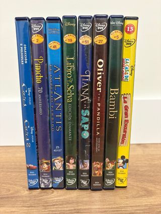 Colección de 8 DVDs de películas clásicas de Disney y Pixar. - Cars 1 y 2 - Pinocho (70 Aniversario) - Atlantis: El Imperio Perdido - El Libro de la Selva (Edición Diamante) - Tiana y el Sapo (Edición 20 Aniversario) - Oliver y su Pandilla (Edición 20 Aniversario) - Bambi - La Gran Excursión (La Casa de Mickey Mouse)