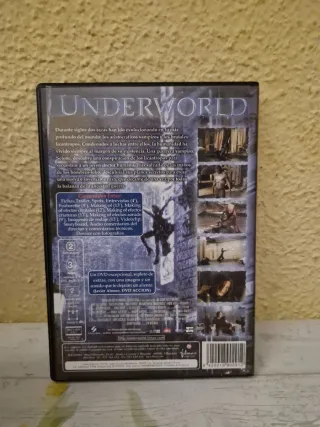 Película Underworld en formato DVD. Incluye 2 DVDs con más de 1hora y media de extras. Protagonizada por Kate Beckinsale y Scott Speedman. Guerra entre hombres lobo y vampiros. Mucha acción.