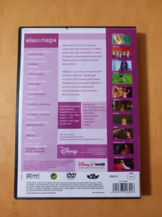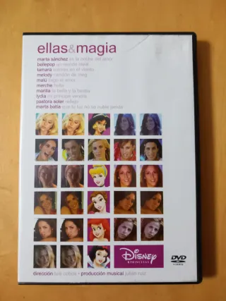 DVD de Ellas & Magia con canciones de Disney Princesas. - Incluye temas interpretados por Marta Sánchez, Bellepop, Tamara, Melody, Malú, Merche, Marilia, Lydia, Pastora Soler y Marta Botía. - Canciones como Es la noche del amor, Un mundo ideal, Colores en el viento, Canción de Meg, Llegó el amor, Bella, La bella y la bestia, Mi príncipe vendrá, Reflejo y Que tu luz no se nuble jamás. - Dirección: Luis Cobos. - Producción musical: Julián Ruiz.