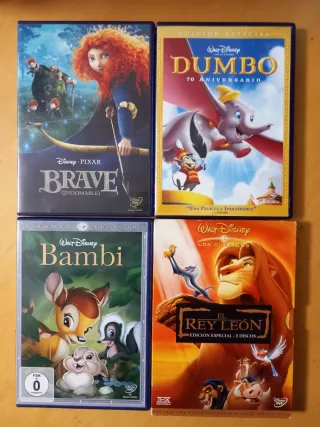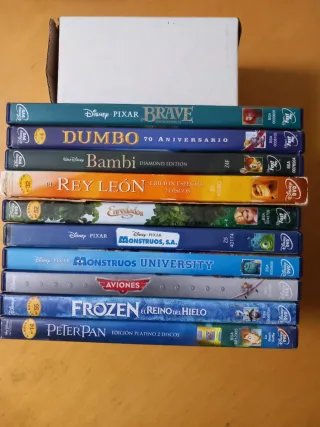 10 películas en formato DVD de Walt Disney - Brave - Enredados - Dumbo - Bambi - Mounstruos S.A - Mounstruos university - El rey león E.E.2dvds - Aviones - Frozen el reino de hielo - Peter Pan Las dos últimas películas tienen evidentes signos de desgaste por el uso que se les ha dado.