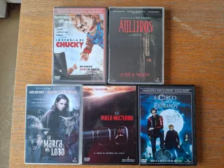 Pack de 5 películas en formato DVD, ideal para los amantes del terror y el thriller. - La semilla de Chucky (sin abrir) - Aullidos (sin abrir) - La Marca del Lobo - Vuelo Nocturno - El Circo de los Extraños