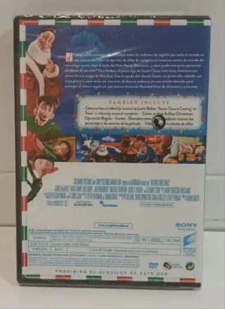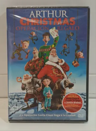 Película de animación Arthur Christmas: Operación Regalo en formato DVD. - Incluye el videoclip musical Santa Claus is Comin' To Town de Justin Bieber. - La carátula muestra a los personajes principales de la película.