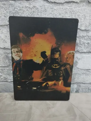 Película Batman en formato DVD, edición limitada. - Incluye Batman (1989). - Protagonizada por Michael Keaton, Jack Nicholson y Kim Basinger. - Diseño de la caja metálica con el logo icónico de Batman.