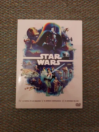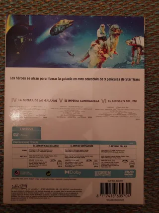 Colección de la trilogía original de Star Wars en DVD. - Incluye las películas IV, V y VI. - Títulos en español: La Guerra de las Galaxias, El Imperio Contraataca y El Retorno del Jedi.
