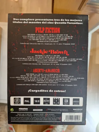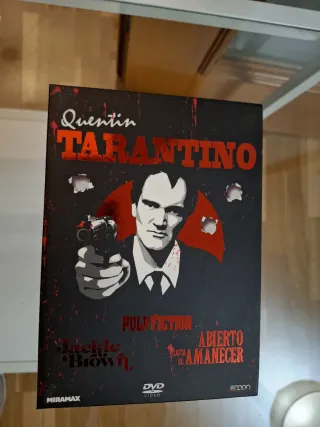 Colección de películas de Quentin Tarantino en DVD. - Incluye Pulp Fiction, Jackie Brown y Abierto hasta el amanecer. - Edición especial con diseño distintivo. - Formato DVD.