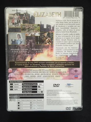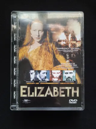 Película Elizabeth en formato DVD. - Nominada a 7 Oscars. - Ganadora de un Globo de Oro a la Mejor Actriz Dramática para Cate Blanchett. - Incluye los títulos: Amante, Asesino, Hereje, Traidor.