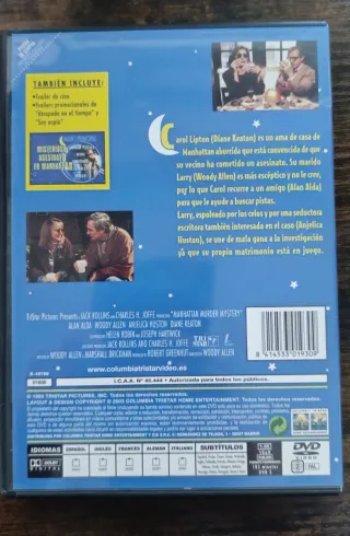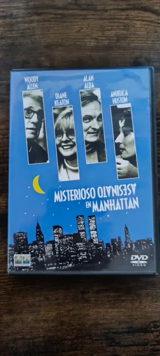 Película Misterioso Asesinato en Manhattan en formato DVD. Disfruta de esta comedia de crimen y suspense. - Incluye audio en inglés y español. - Portada con Woody Allen, Diane Keaton, Alan Alda y Anjelica Huston.