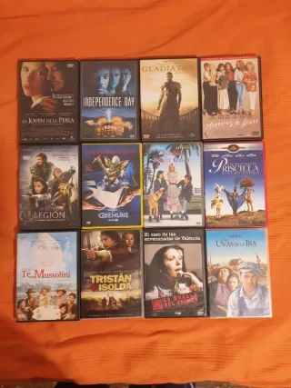 Colección de películas en formato DVD, con una variedad de géneros para todos los gustos. - La Joven de la Perla - Independence Day - Gladiador - Magnolias de Acero - La Última Legión - Gremlins - La Verdad sobre las Chicas - Priscilla, Reina del Desierto - Té, Mussolini - Tristán e Isolda - El Caso de las Envenenadas de Valencia - Las Uvas de la Ira