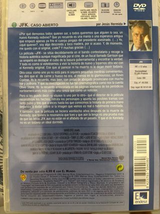 DVD de la película JFK, Caso Abierto, dirigida por Oliver Stone y protagonizada por Kevin Costner. Está en perfecto estado. - Incluye el DVD de la película JFK. - Edición en Castellano, Inglés, Francés, Italiano, Alemán y Sueco. - Subtítulos en Castellano, Inglés, Francés, Italiano, Alemán y Sueco.